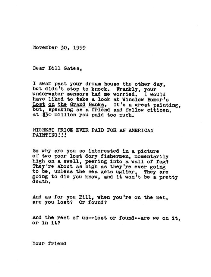 1990年代網際網路尚在起步階段時,比爾.蓋茲意識到網際網路將會成為公眾的通道和市場,任何圖像都存在被重新使用的可能性,便開始大量購買歷史照片與影像,對數以百萬計的印刷品和底片進行數位掃描,再將建檔後的影像文件經由Corbis公司來訂價與銷售──誰擁有了最多圖片,誰就獲得視覺文化的話語權。塞庫拉以流動的物理空間和虛擬空間來類比海洋和網際網路。在匿名信末尾,他問道:「對你來說,比爾,當你在上網時,是迷失了嗎?還是被發現了?而其餘的我們──迷失了?還是被發現?──我們是在其之上,還是身在其中?」