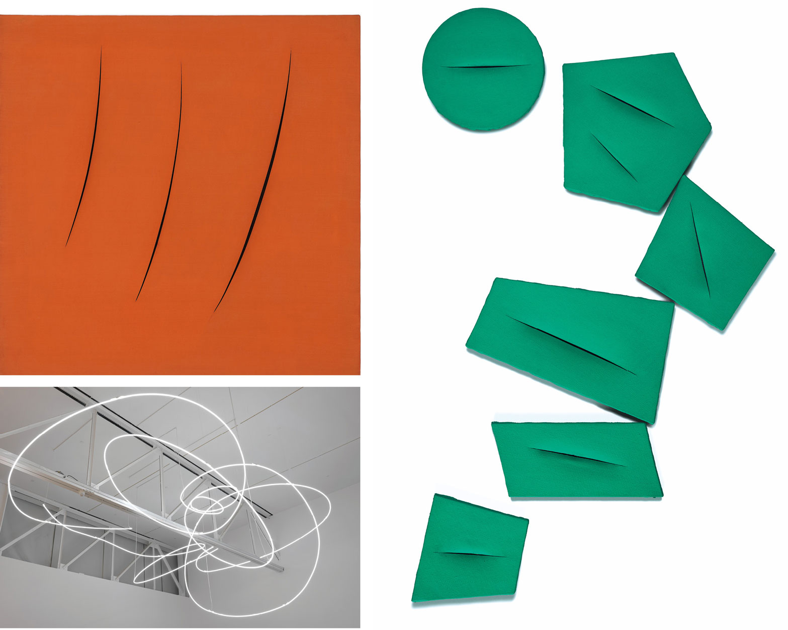 1958年,義大利半島經歷二次世界大戰後區域經濟全面復甦,一派欣欣向榮;同一時期,鐵幕兩頭的冷戰與核武競賽,讓全球的緊張關係處於前所未見的高峰,盧齊歐.封答那(Lucio Fontana)手起刀落,俐落地在單彩的二度平面畫布上打開了一個蟲洞,那一刀,陽剛、些許暴虐,破壞了原有的空間結構,激進地拓張了收斂的平面,並在突破緊繃氛圍的同時,灑脫地帶來一絲不確定的狂喜,就這麼樣地,他以「空間概念」(Spatial Concept)系列,在藝術史上畫下了封答那獨一無二的個人標誌。