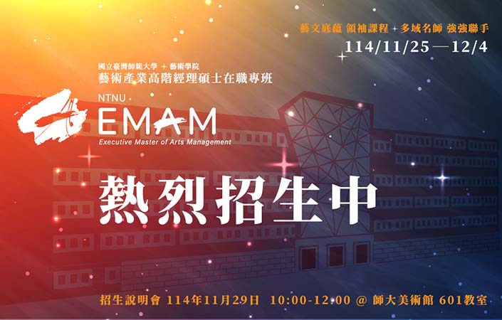 國立臺灣師範大學藝術產業高階經理碩士在職專班(EMAM)115學年度熱情招生 臺師大藝術學院「藝術產業高階經理碩士在職專班」(Executive Master of Arts Management, EMAM)正式啟動115學年度第二屆招生,報名自11月25日起至12月4日止。EMAM以「藝術為底蘊、管理為核心、創新為導向」為教育願景,設計四門核心課程,並整合「藝術鑑賞與典藏素養」與「藝術經營與行銷策略」兩大主軸課程。 → read more