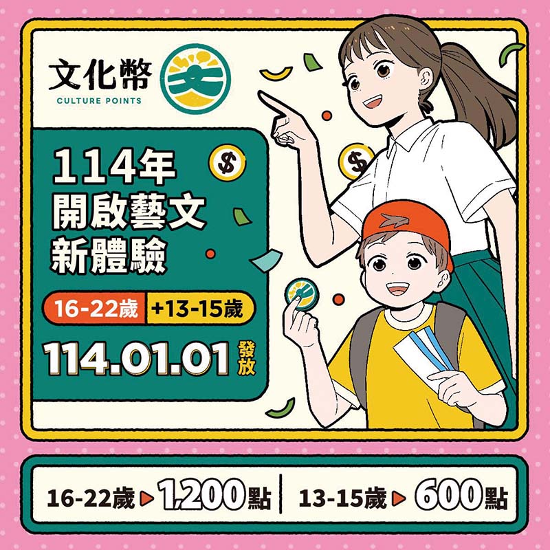 2025年文化禮金自1月1日起開放領用,文化部除了繼續發放16歲至22歲青年1200點文化幣外,推出13歲至15歲試辦計畫,發放每人600點文化幣。