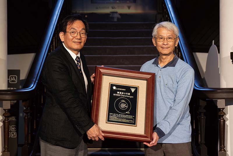 由國立中央大學副校長陳文逸(左)頒贈陳澄波小行星銘牌予財團法人陳澄波文化基金會董事長陳立栢。