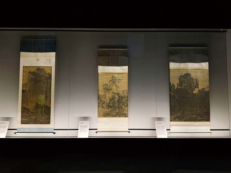 左至右:范寬〈谿山行旅圖〉、郭熙〈早春圖〉、李唐〈萬壑松風圖〉於國立故宮博物院南部院區展場一景