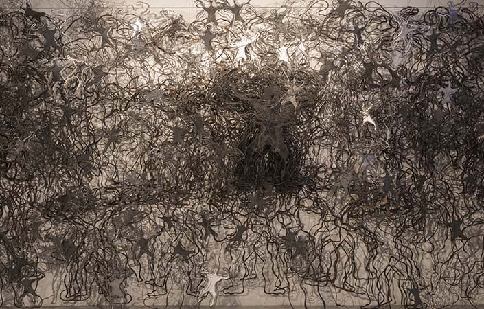 在「作為人」這檔展覽中,劉柏村的雷射切割鐵人輪廓,是從制式的工業鋼板上裁切而下。它們每一個都能像一長串的剪紙人形般密集地聚攏或被拉開。一旦拉伸後它們便成為一條可變形的鏈狀體,劉柏村藉此在空間中塑造出不同的量體,透過壓縮或擴張,創造出密度、紋理以及更宏大的連結——最終呈現為一種雕塑的「風景」。