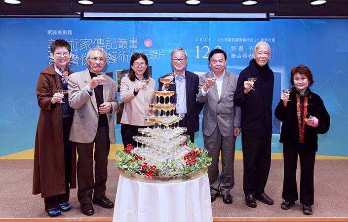 文化部所屬國立臺灣美術館攜手藝術家出版社及後視野傳播事業有限公司,12月3日在張榮發基金會國際會議中心舉辦2025年「家庭美術館─美術家傳記叢書」與「臺灣傑出藝術家紀錄片」新書.影音聯合發表記者會。