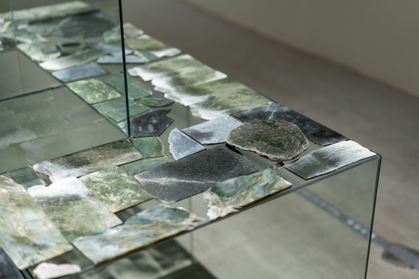 江凱群 豐田玉庭院 複合媒材、閃玉、墨玉、臺灣相思木、人造矽酸鹽礦物、聲音、攝影、玻璃箱