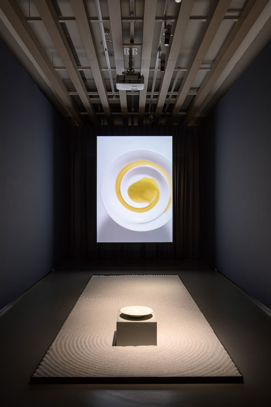 自〈螺旋〉盤衍生的錄像作品,是在看見餐廳使用〈螺旋〉盤後所產生的想法。我注意到,廚師們總對這個設計非常興奮,會花時間將醬汁倒在螺旋軌道上,滿足地看著它擴延到盤子底部。不過,也許是餐廳忙碌的關係,他們逐漸放棄使用螺旋軌道,視它為一個普通的盤子。起初,我感到有些失望,但後來我意識到這是可以理解的現象,畢竟螺旋設計不是必需的,無論沿著螺旋軌道移動,或是直接倒入盤子中心,醬汁和菜餚的味道皆相同。然而,不同之處在於,它增加了視覺上的美感,也提升了體驗的價值,如同觀賞藝術展與享受美食,儘管不是生存必需品,卻為生活增添了樂趣,當我們有足夠的時間,才有機會沉迷於美麗。