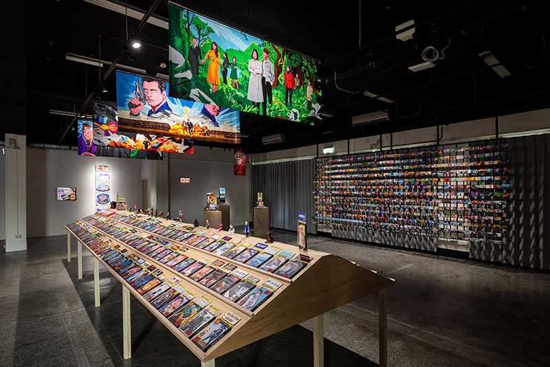 通信分隊展演空間盛放的是關於重大政治、社會運動或災難事件的作品。崔元準〈今日亞非〉展呈的多件立體雕塑和照片放置在如祭壇的台座上,藝術家透過翻拍北韓政府國家檔案再輸出影像或3D列印,將早年北韓政府於冷戰期間跟建立邦交關係的非洲國家互相贈予的外交禮物重新集結於當代現場,並同時展出共產陣營政治大外宣的宣傳影片。武田慎平的「痕」攝影系列是他在2011年福島核災發生後,從當地採集了十六個受輻射汙染的土壤樣本,並將底片埋在土壤當中進行感光,經過數個月後再挖出底片、沖洗成像;他利用底片的物質性創作出無相機拍攝的攝影作品,可謂極為真實地記錄下福島核災的影像。這起重大災難的影像紀錄,所呈現的卻是如宇宙深邃的星群。 位於圖書館展演空間二樓,李漢強的〈漢強影音〉召喚已然消逝的DVD燒錄文化,他以勞力密集繪畫方式手繪出光碟、DVD封套等「拷貝」串流影集劇照,猶如讓觀者回到串流影音時代前的DVD出租商店,也影射如今的觀影者受困於過剩的影音產物無法自拔的處境。