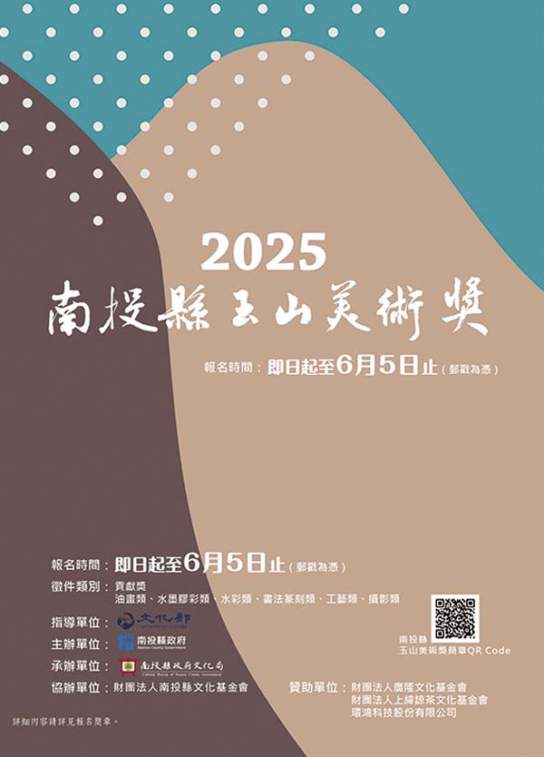 本次徵件分初選、決選兩階段,有意報名者可於初選報名期間:即日起至6月5日止,備妥所需資料後親送或以郵戳為憑掛號寄至「540南投市建國路135號/藝術科」,信封註明「2025南投縣玉山美術獎」。活動詳情