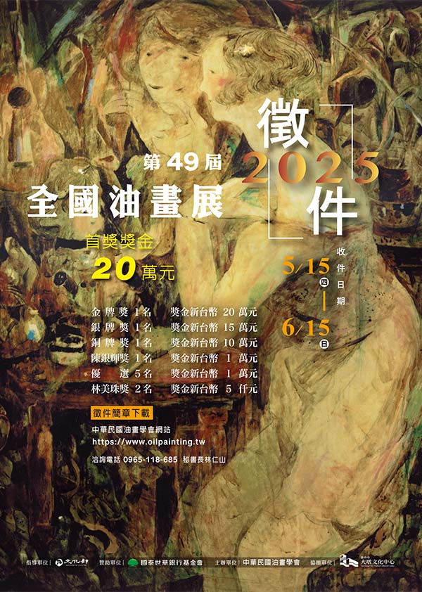 中華民國油畫學會為鼓勵全國油畫創作風氣,提昇油畫創作水準,發掘優秀創作人才,舉辦「第四十九屆全國油畫展」徵件。凡具中華民國國籍的十八歲以上藝術工作者,皆可以最近兩年內完成之未曾公開展示的20號至50號油畫作品報名參賽,每人限提送一件作品。