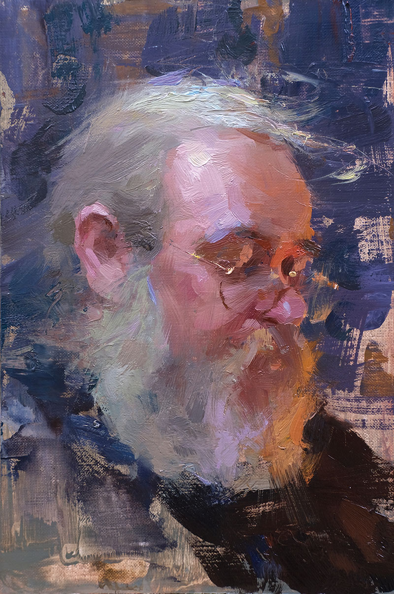 這樣的創作意識,也對應了曾新耀對美國寫實主義藝術家理查.施密德(Richard Schmid)的景仰,啟發他對於人物畫創作的觀念與美學傾向。他分享道,最初被施密德的作品所吸引,源自他在繪畫中從容不迫、豪放瀟灑卻不失精準的筆觸,還有豐富且細膩的色彩變化以及比例拿捏到位且耐人尋味的構圖。他猶記在大二課堂看到施密德現場創作肖像的示範教學紀錄影像時內心的震撼,對於他在創作當下的全然沉浸與歡快,彷彿全身每一個細胞都為此時此刻服務的高能量投入,同時並樂在其中,那樣的境界深深觸動著他,也讓他領悟到以簡馭繁的道理。自學院訓練出身,曾新耀明白也掌握肖像創作對於畫者繪畫技術的高度要求,以及在畫面中處理多種複雜資訊的能力,而他現階段更傾向於以生動、寫意的方法探索肖像畫的表現性,他舉美國藝術家沙金(John Singer Sargent)的肖像畫為例,其俐落、簡約的筆觸在形構畫面重點部分時點到為止,不停留在細節上做過多反覆的修飾和描繪,亦能達到兼備形神的人物個性,也是他相當欣賞的創作特質。「如何用一、兩筆即能交代畫面故事,而不是用廿幾筆」,如此減法的做法得以成立,立足在堅實的素描基礎與對油彩顏料特性的駕馭。對於畫面的簡化,以及如何張馳有度地平衡虛與實之間的那個「度」,以充盈運用在整體視覺表現,同時更要靈動地展現作畫對象的神韻,成為曾新耀近年來發展與琢磨的個人風格。(全文閱讀600期藝術家雜誌)