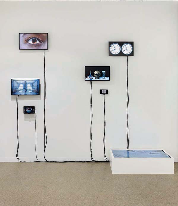 2025巴塞爾藝術展巴塞爾展會馬凌畫廊展位一景,牆面展出何子彥「時計」系列錄像作品。