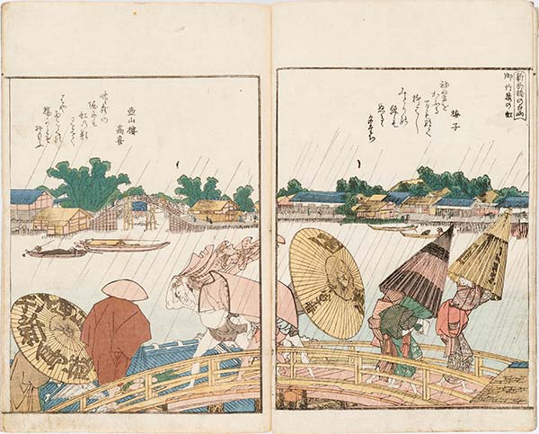 對面的展櫃同樣將視角鎖定隅田川,陳列葛飾北齋刻畫的〈富嶽三十六景:御廄川岸看兩國橋夕陽〉和小林清親的〈隅田川夜〉等作。朱龍興特別說明並列前述兩件畫作的用意,在於使觀者透過對照傳統的江戶浮世繪與近現代的新版畫,了解無論是過去的江戶城還是當前的東京都,城市始終在時間中前行、流變。在此還能欣賞到《繪本隅田川兩岸一覽》,裡頭盡是葛飾北齋以三冊繪本收錄隅田川從開春到冬藏、從下游至上游的沿岸風光,策展團隊特地選擇〈新柳橋白雨〉(「白雨」指的是令人措手不及的雷陣雨)做為開卷面客的頁面之一,扣合夏季展期驟雨匆匆的天氣型態。