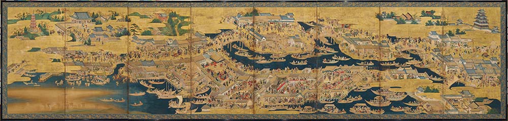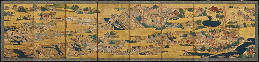 我所遊賞的隅田川「川流豐華」,由東京出光美術館藏品〈江戶名所圖屏風〉(5月30日至6月15日限期展出)揭開序幕。這件被列為日本重要文化財的屏風,以八曲一雙的尺幅展現隅田川自位於現在上野恩賜公園內的寬永寺起始,蜿蜒流向江戶灣(現東京灣)出海口的水脈網絡,以及伴隨其舒展開來的17世紀江戶人的日常和節慶活動,恍如故宮珍藏的清院本〈清明上河圖〉的變奏。朱龍興提醒我們不妨細查畫面中的幾處細節:穿著葡萄牙服裝參加淺草寺祭典的民眾、原吉原的情狀、完整的江戶城天守閣、例行性前往江戶城拜會將軍的韓國使節,以及京橋下方的歌舞伎場址和東海道的出發點等;另外,沐浴相關的場面背後,是江戶城建設方興未艾而遍布風沙的時代景象,自此衍生的錢湯(公共澡堂)文化流傳至今。朱龍興表示,換檔陳列的作品亦構成時間層次的對話,領銜登台的〈江戶名所圖屏風〉展示17世紀江戶的風貌演變,接棒登場的手卷畫〈淺草風俗畫卷〉展現18世紀淺草地區的景觀,而第三檔次上演的〈江戶景觀圖〉則引人觀覽19世紀受到西方影響之下的鳥瞰圖情貌。