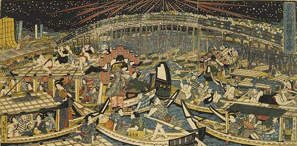 〈新柳橋白雨〉中的雨勢接續落在第二單元「城市時光」。葛飾北齋的〈富嶽三十六景:山下白雨〉上方是映襯富士山的藍天白雲好時光,下方山麓卻是一片閃現電光的烏黑,而雷雲之下興許是如歌川廣重作品〈名所江戶百景:大橋安宅驟雨〉般滂沱的雨幕。下完雷陣雨後的陣陣晚風總引人外出乘涼。在「隅田川上的煙火大會」子題,溪齋英泉的〈東都兩國橋夕涼之景色〉描繪江戶人在農曆5月28日至8月28日乘船遊覽、欣賞「兩國的川開」(現隅田川煙火大會)的夏夜風情。若想進一步解惑兩國橋所在的河岸風光,鄰旁歌川國鄉的〈東都名所:兩國繁榮河開之圖〉提供了視野,夜市攤位與見世物小屋(類似驚奇博物館)交織成歡騰的光景。除了看煙火,彼時的歌舞伎演員也把隅田川當作舞台。在歌川國芳的〈兩國橋納涼與煙火景色〉裡,前景的歌舞伎演員各個在「擺拍」,經由各式各樣姿態的身體語言展示服裝、演繹神色,同時也展演個人魅力,吸引各自擁戴的戲迷前來觀賞。(全文閱讀603期藝術家雜誌)