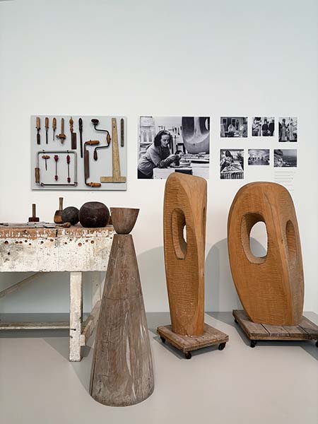 黑普瓦絲美術館的館藏目前超過五千件,其中以黑普瓦絲的創作為核心,逾四十件作品由黑普瓦絲的女兒瑞秋.基德(Rachel Kidd)和莎拉.鮑內斯(Sarah Bowness)透過藝術基金慨捐,完整呈現她從概念提煉到定型成品的創作歷程,這一系列藏品不僅在數量上位居全球前茅,也在學術研究與大眾教育方面發揮重要影響。展間以藝術家在康瓦爾郡聖艾夫斯(St Ives)的第二個工作室──舞蹈宮(Palais de Danse)為概念,將黑普瓦絲的手稿、模型、工具和檔案等一一呈現,讓觀者如置身於藝術家的工作現場,深入了解她的創作細節和發展脈絡。其中最受矚目的作品是〈有翼的人物〉,這件由英國老牌約翰.路易斯百貨公司總部(John Lewis & Partners)委託的創作,高達近6公尺,是藝術家晚年眾多大型委託創作中唯一倖存的模型。