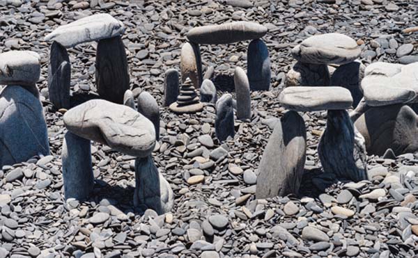 周珠旺生活、創作於屏東,家中養鴨。從童年時光看顧鴨群、拾取鴨蛋這種不斷反覆、類修煉的肌肉反射記憶,讓周珠旺透過慢慢地、一次又一次地用油彩堆疊出厚重肌理的創作方式來呈現他的藝術世界。此次展出的最新創作〈石陣〉,畫面中沉默的石群排列如史前巨石陣般莊嚴,而中央的堆疊又如西藏瑪尼堆般靜靜佇立,承載祈願、保護與精神寄託。在轉換與符號語言之中,既指向與大地的深刻連結,也隱含祈福、療癒與朝聖的意義。