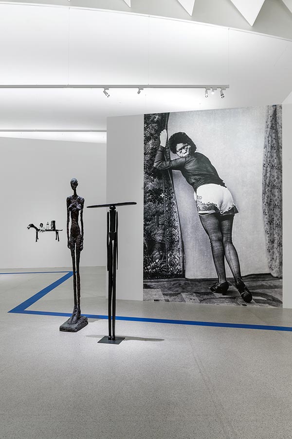 原籍奈及利亞的挪威藝術家芙莉坦.歐莉帕博,同樣擅長運用影像來挑戰人們的慣有觀點及社會所形塑的刻板印象。不過有別於龐格的攝影創作,歐莉帕博使用的影像均是她從舊市場或是網路上蒐集、累積的回收資料,呼應其本身同時也是社會學家的研究工作模式。因為從小成長於一個幾乎只有白人的世界,歐莉帕博早期的拼貼(collage)創作主要以黑人女性為主題,但她也漸漸開始使用動物的影像,讓其原本集中在種族和性別的批判議題以更多元化的模式納入動物權的概念。此次展覽受mumok之邀,歐莉帕博從美術館典藏中擇選出數件現代主義雕塑作品來呼應她的數位影像創作。其中值得一提的組合有她將自己的作品〈轉身〉伴隨著露易絲.布爾喬亞(Louise Bourgeois)的〈觀察者〉和傑克梅第的〈站立的女人Ⅲ〉一同陳列,這三件交錯的作品分別呈現三名往同一個方向觀看的女性,看似在挑戰觀者的眼光與偏見。另一令人印象深刻的作品集結是mumok典藏的三件歐莉帕博的〈無題〉,與展出的另外三件現代主義雕塑產生鮮明的對比,分別是布朗庫西1933年作的〈金髮黑妞Ⅱ〉、亨利.勞倫斯(Henri Laurens)1935年的〈母親〉,以及奧西普.柴金1922年的〈女性形式〉,猶如見證著當年男性藝術家如何看待女性的不同觀點──不是過度誇張,就是過於刻板,又或是幻想太甚。