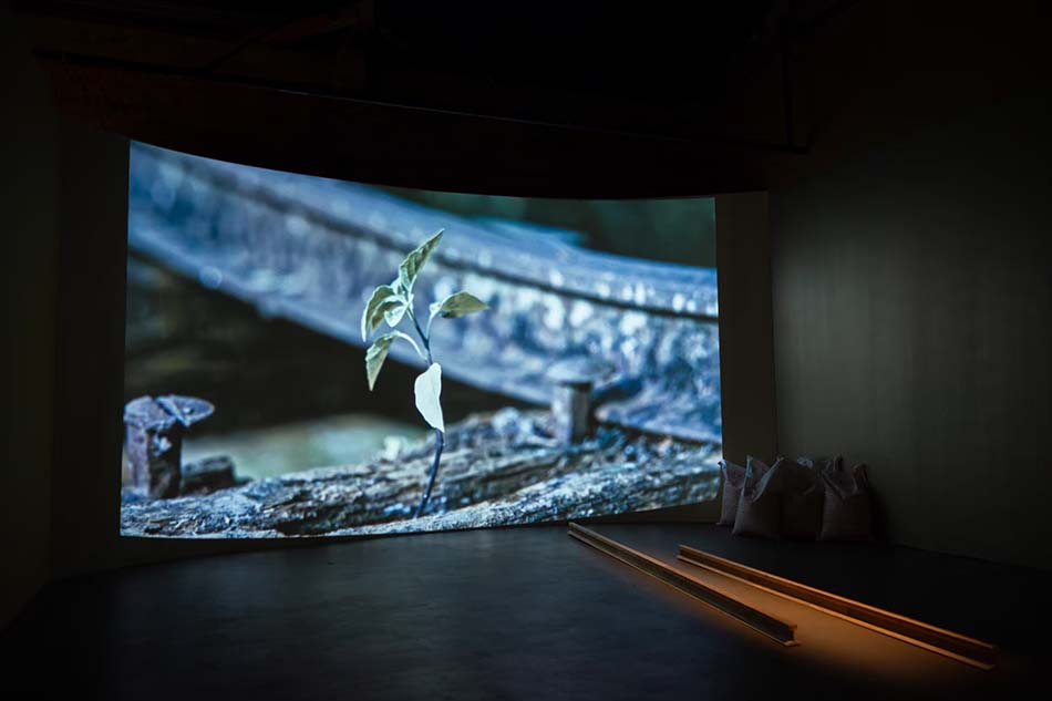 洪琳茹以田調與訪談為基礎,運用蔗渣、殘件與老照片重構糖鐵沿線的風景。影像作品〈無以為跡〉帶領觀眾走進隱沒的鐵軌與荒廢橋體,如同透過車窗凝視那段遠去卻仍存於土地與記憶中的時光。洪琳茹的作品以蔗渣與鐵軌承載歷史,透過隱匿與抒情的手法,述說糖業過往的文化脈絡。