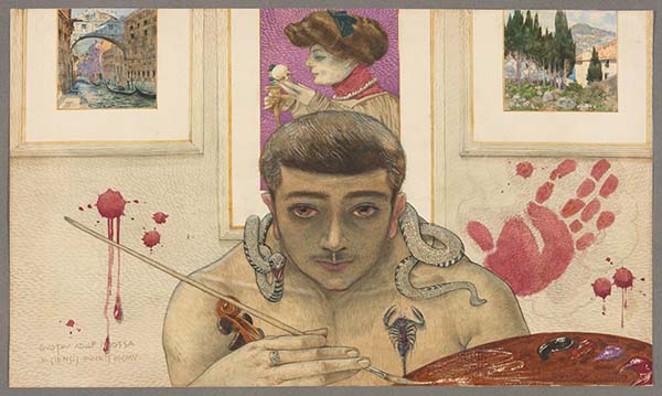 另一位法國藝術家古斯塔夫─阿道夫.莫薩(Gustav-Adolf Mossa)則以〈藝術家的心理肖像〉呈現受苦藝術家(tortured artist)的形象,這一觀念源於19世紀以來對藝術家為痛苦天才的浪漫想像,象徵創作與煎熬之間的緊密聯繫。畫中他藉由調色盤與畫筆象徵創造力,卻在胸前繪上蠍子、蛇與血手印這些危險符號;人物直視觀者、神情平靜,彷彿在凝視自己內在的陰影。這種以象徵揭示心理世界的方式,正是象徵主義的核心。