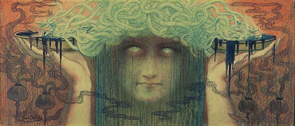 1896年,尚.德爾維勒(Jean Delville)創立「理想藝術沙龍」(Salon d’Art Idéaliste),視神祕學與玄學為基礎,追求精神與藝術的「理想」,他的創作〈梅杜莎〉以色鉛筆刻畫蛇髮女妖,其注視觀者的雙眼被煙霧與藍色面紗包圍,既迷人又危險。德爾維勒藉著這樣的意象試圖超越物質世界,進入純粹的精神層面。(全文閱讀607期藝術家雜誌)