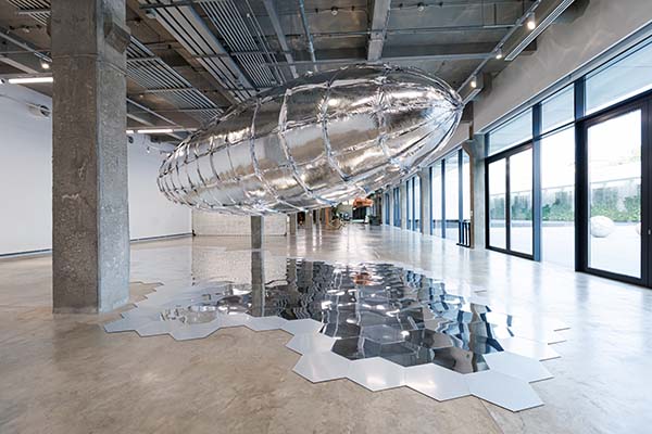 一樓展廳空間開闊而深遠,由兩座相連的大型展室構成,為大尺幅作品提供充足的呼吸空間。其間,一件宛如銀色氣球般懸浮的裝置靜靜佇立,韓國藝術家李昢的〈甘於脆弱─金屬化氣球V3〉以其輕盈而強烈的存在,將觀眾的感知推向宇宙尺度,重新思索人類與無垠之間的距離。作品以金屬化表面的氣球形體懸置於建築空間之中,其尺度和反光質地營造出一種介於輕盈與壓迫、脆弱與力量之間的張力;看似隨時可能破裂的形態,與其實際上被金屬外殼所強化的結構形成矛盾,揭示「脆弱性」並非對立於力量,而是其內在條件。李昢延續長期對身體、理想化形式與失敗敘事的關注,此作將原本短暫、易逝的氣球轉化為近乎永恆的雕塑存在,使不穩定性被固定於形式之中。