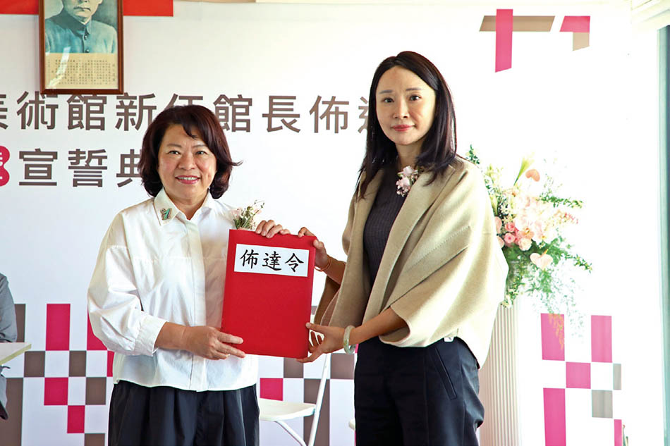 嘉義市立美術館新任館長潘青林(右)與嘉義市長黃敏惠於宣誓就職典禮合影