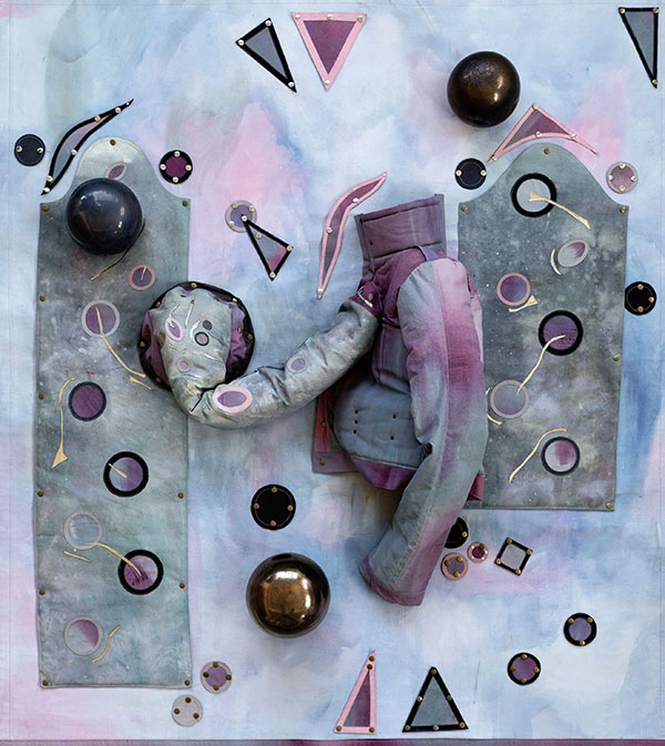 Mathilde Denize, Sound of Figures, Acrylique et aquarelle sur toile, céramiques émaillées, feutre, métal 180 x 200 x 35 cm, 2025. Photo: Erwan Fichou © Mathilde Denize / ADAGP, Paris, 2025 Courtesy de l’artiste et de la galerie Perrotin
