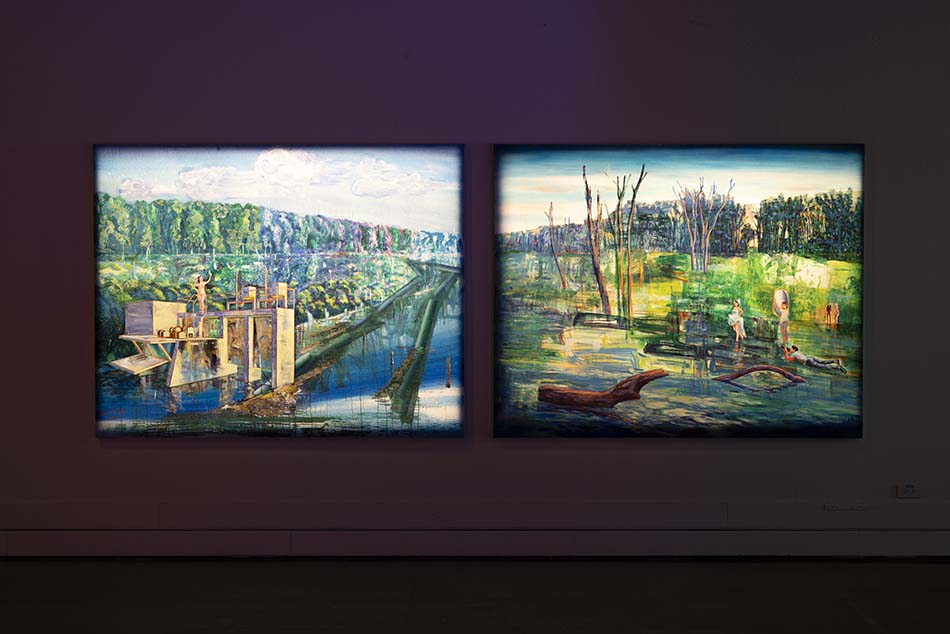 吳佳容在〈嫁給一片海洋〉系列中,以布料與纖維裝置表現她與澎湖地景之間的關係。透過光線與纖維的變化,她描繪出潮汐與島嶼之間如呼吸般的節奏。張新丕的繪畫以「熱帶天堂」為命題,以鮮明色彩描繪臺灣南部的檳榔園、鳳梨田、魚塭與海堤等地景,藉此反思自然環境的改變以及人造景觀的荒謬。泰國藝術家美嬋(Sasiwimal Chonlabut)則從家鄉芭達雅夜晚海岸的霓虹光影出發,透過流動的光線象徵稍縱即逝的幸福與希望,引導觀者回到內心尋找真正的滿足。