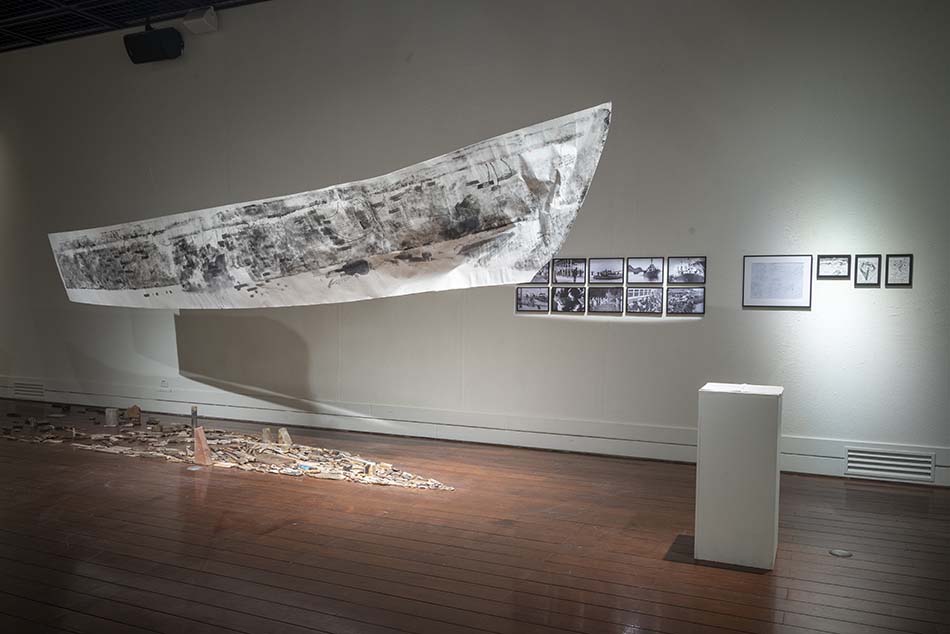 韓戰後南北韓以北緯38度線分隔,在冷戰期間曾有多起韓國漁民被綁架至北韓的事件。藝術團隊UMSO(嚴京煥與金素廷)透過檔案、照片與拓印漁船的方式重現歷史,並以433塊漂流木象徵433位受難者。在東亞文化中,海洋亦承載著對理想世界的想像。韓國藝術家羅賢(Nahyun)取材自蓬萊仙島神話,以東亞傳統圖像為基礎拼貼軍事迷彩與直升機剪影,藉以諷刺當代社會對烏托邦的想像與政治現實。