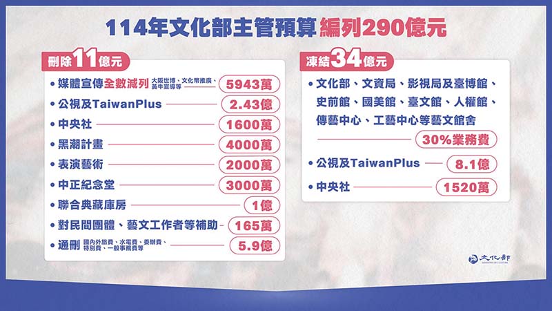2025年度中央政府總預算案於1月21日三讀通過,文化部主管預算原編列290億元,經初步計算共刪除11億元、凍結34億元。刪除部分涵蓋各機關國內外旅費、水電費、委辦費、特別費、一般事務費等通刪數共5.9億元;其餘被刪除項目包含媒體宣傳5943萬全數刪除、公視及TaiwanPlus共2.43億元、中央社1600萬元、黑潮計畫4000萬元、表演藝術2000萬元、中正紀念堂3000萬元、聯合典藏庫房1億元、對民間團體與藝文工作者等補助165萬元等共5.1億元,合計刪除11億元。凍結部分共計四十九案為文化部、文化資產局、影視及流行音樂產業局等藝文館舍的30%業務費。