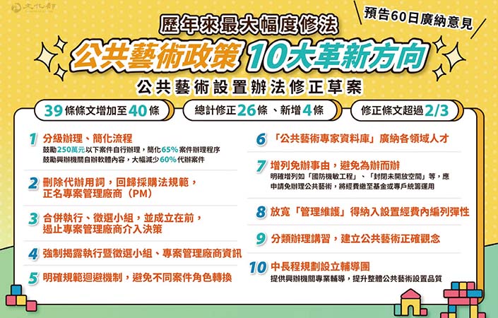 文化部於3月14日公布「公共藝術設置辦法修正草案」預告六十日,廣納各界意見。文化部表示,台灣公共藝術政策推動卅餘年,歷經六次修法,為釐清各界對當前制度執行疑慮及建議,文化部自去年9月起密集召開十三場諮詢會議及兩場公開交流會……