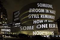 以文字藝術聞名的美國藝術家珍妮.霍澤特別為古根漢美術館打造的電子標誌作品〈古根漢美術館裝置藝術〉。霍澤將整座美術館視為一件裝置藝術,將作品放置在戶外花圃和洗手間等意想不到的空間。除了佔據建築中心、環繞坡道的亮眼電子標語之外,霍澤從1970年代至今的作品也散落在展間坡道上,帶給觀者沿途的偶遇。