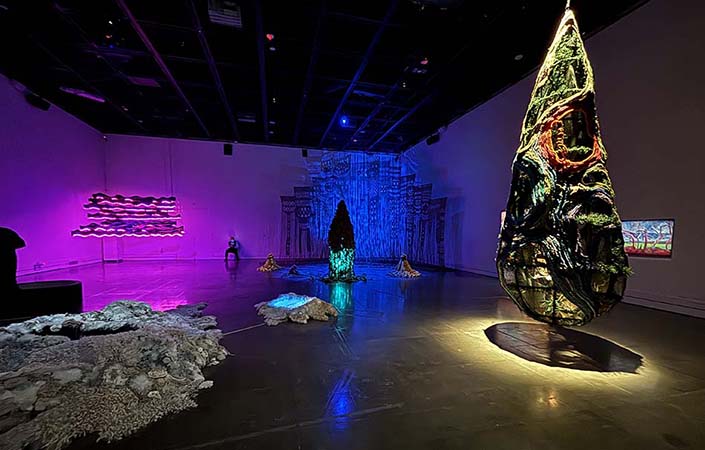 本展從當代藝術中「纖維」與「軟雕塑」的媒材概念出發,連結亞洲與南島文化的族群記憶,探討人們如何透過編織與圖騰敘述跨越海洋的故事,同時也呈現藝術家如何運用纖維與空間的延展性,回應當代社會與生命處境。