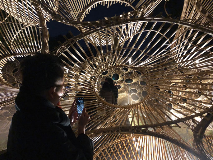 台中后里舉辦的「台灣燈會」主燈以林舜龍〈森生守護──光之樹〉融合地景,導入光影科技。