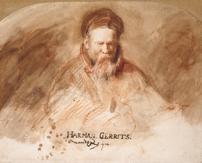 年輕的林布蘭特早已對老年人的神貌風采展現高度興趣,創作中流露出對於衰老的溫柔憐憫,以及被描繪對象由內而發的智慧光芒。從這些作品中,觀者可知林布蘭特絕世名作中的光影處理、戲劇化呈現,是其一生的關注焦點,從生涯早期就開始醞釀。展覽中的作品〈林布蘭特的父親〉(Rembrandt’s father)分兩階段完成,首先於1627年以紅色與黑色粉筆繪製,而後於1630年以咖啡色暈染處理,推測與林布蘭特父親的過世有關。這件作品以非常簡單的線條創作,沒有太多的色澤變化以呈現豐富光影,但畫作的氛圍卻傳達出一股溫熱情感;畫中的年邁男性微微閉著雙眼、有著跟林布蘭特一樣的豐厚鼻頭,面容讓人感覺熟悉,神情沉穩而莊嚴。