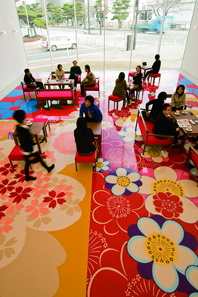當年,為了讓大量馬匹通行而拓寬至36公尺、長達1公里的軍馬補充部正門大道,如今成為貫穿十和田市中心的「官廳街道」。在這條種植一百六十五棵松樹與一百五十六棵櫻花樹的氣派街道上,馬匹銅像、馬蹄裝飾紀念著往昔的名駒榮景,而韓國藝術家崔正化的作品〈花馬〉是其中最巨大、華麗的馬匹雕塑,彷彿剛從花叢間打滾而出,被綻放花朵包裹著的牠高舉著前腿要人停下,因為十和田市現代美術館即在眼前。馬兒視線的另一頭也綻放著熱鬧繁花,從大面玻璃窗能望見台灣藝術家林明弘的作品〈無題〉,其創作發想來自十和田市傳統工藝「南部裂織」,如絨毯般開展於咖啡廳地面。