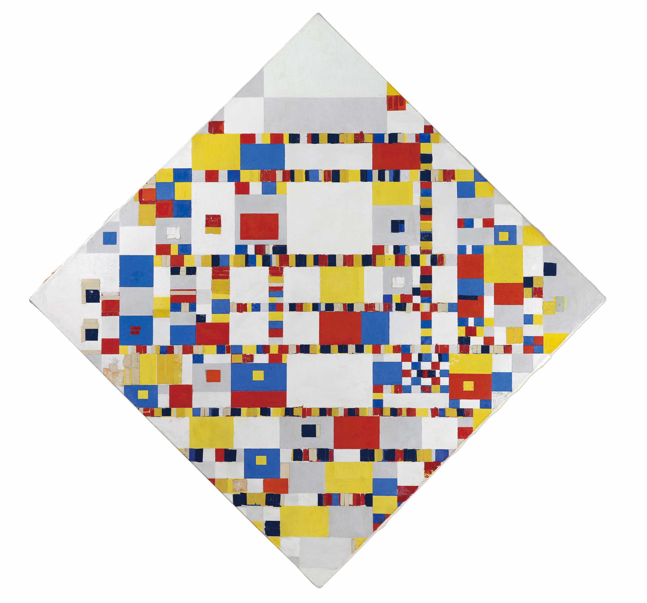 Piet Mondriaan, Victory Boogie Woogie, Olieverf, tape, papier, houtskool en potlood op doek. Hoogte 127.5cm en breedte 127.5cm, 1942-1944 (New York). Bruikleen van ICN, Amsterdam.