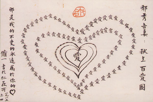 是的,他不僅常表達,而且還有一幅〈百愛圖〉,這幅字是他在獄中完成的,當時我們無法見面,須獲准許才能探望,所以他就把思念化成〈百愛圖〉,我收到時還不太相信,仔細算算還真有100個「愛」字……。這份深情,足夠令我刻骨銘心了。