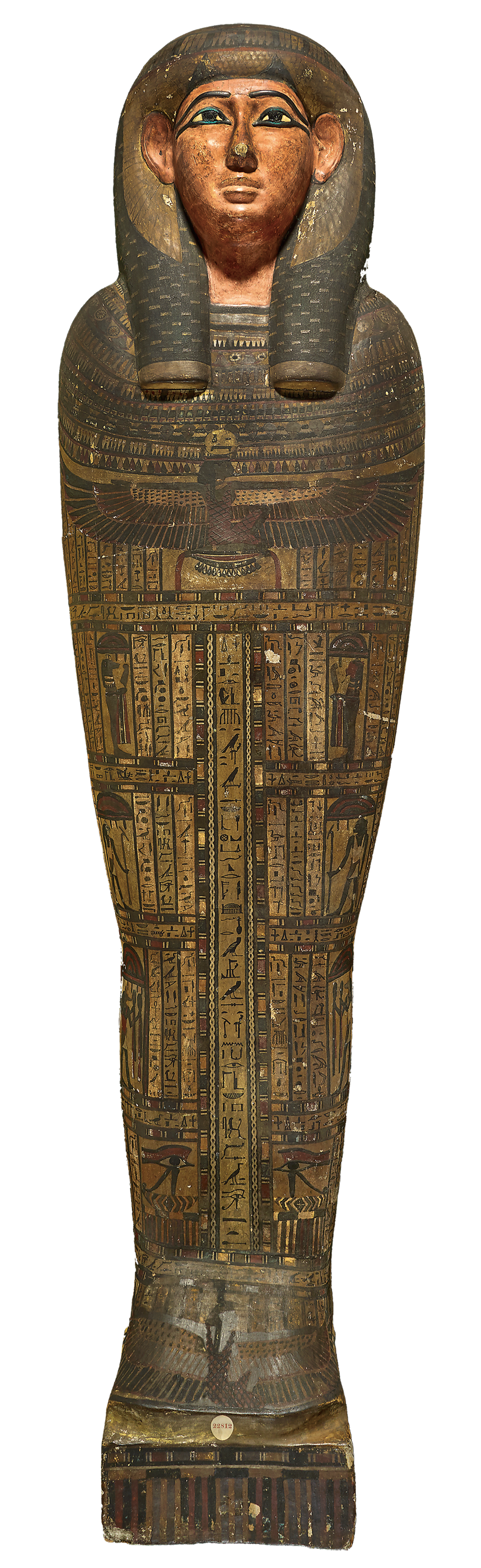 在第三中間期,使用類似此具木乃伊容器的作法相當普遍。這種容器不同於棺槨,不易被移除或再利用,因為無法避免破壞製作時使用的易碎灰泥。棺主的名字與頭銜通常銘刻於表面,且在多處出現。原本用以封住腳部開口的木板已遺失,取而代之的是一塊現代木板。木乃伊容器足部周遭已毀損,並染上汙漬,以致無法判讀順著腿部往下刻寫的文字結尾,以及原本銘刻在那的棺主之名。不過,剩餘的銘文倒是提及了棺主的頭銜,顯示這具木乃伊生前是位女祭司:「赫西特.賀努.恩.艾爾蒙」或「阿蒙神廟內殿歌者」。