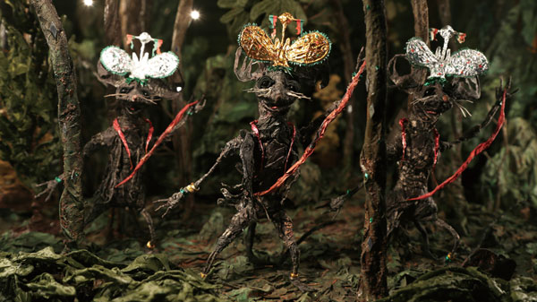 張徐展關注動畫創作如何在當代美術館中擴延「電影」與「動畫」的概念,透過對展示空間的運用與探索,創造「複眼式」的觀影體驗。當紙紮偶作品成為「演員」,為他齊聚一堂、出演各自文化語言所講述的同一故事母題,它們便進入藝術家藉由影像、音樂、扮裝打造的自由空間,在相遇與碰撞間「去象徵化」,展現當代日常的眾生相。「在地」符號不須依靠排他的典故,而在重疊的敘事間找到相連的可能,以及通往彼此故事的全新觀看方法。