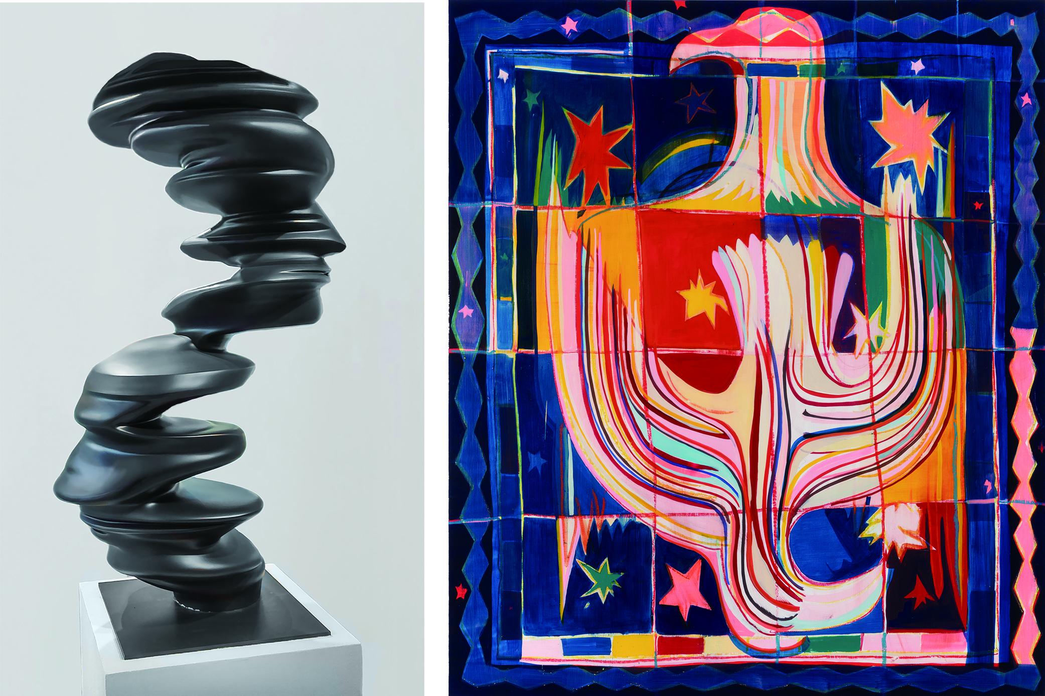 左.Tony Cragg 心之所繫 銅 70x68x143cm 2013 / 吉爾.德.貝蘭庫爾 倒置的老鷹 油彩畫版 152.4x177.8cm 2017 (圖版提供:新畫廊)