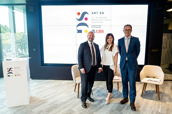 左起新加坡藝博會聯合創始人任天晉、新加坡藝博會總監楊淑茵、瑞銀財富管理亞太區聯席主管及新加坡主管奧古斯特.海泰克(August Hatecke)於記者會合影