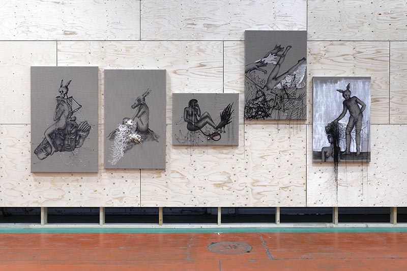 本屆參展的藝術家年齡大多介於卅至五十歲之間,但在開幕當天,筆者非常訝異看到一位銀髮女性藝術家希爾維.瑟里格(Sylvie Selig),她今年高齡八十一歲,兩位策展人是在Instagram上看到她的作品,決定邀請她參展。瑟里格的作品面向多元,有單純的素描加上刺繡,另外還有一件長達50公尺的大型橫幅油畫〈無家可歸〉,藝術家說她自己也是在展場才第一次看到這件作品整個展開的全貌,因為在工作室中她一次最多只能展開3公尺。大壁畫描繪一位年輕人為躲避戰爭而逃離家園,卻遭到單位的追捕,途中巧遇一隻野兔幫助他渡過難關的故事,整幅長卷伴隨著巴布.狄倫(Bob Dylan)「Oh, mama, is this really the end?」的歌詞。在布滿繪畫的兩道牆面中間置放的是廿八位奇特家族人形雕塑,她以裁縫師使用的模特兒為基座再加上混凝紙漿塑形而成,並且廢物利用,將她蒐集到的羽毛、布料、繩索、植物甚至動物標本等,創作出一個奇幻的世界。