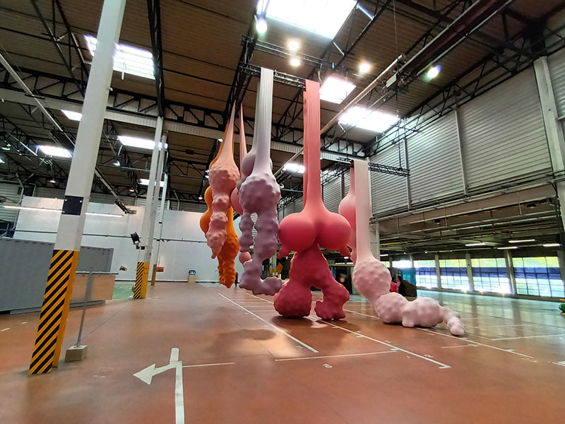 出生於巴塞隆納、目前定居倫敦的艾娃.法布卡斯(Eva Fábregas)以充氣的塑膠球裝入彈性纖維中,成為巨型雕塑,粉色系為主的外表有如人體內臟器官,亦彷彿某些奇異的植物部位。這件限地製作的雕塑既柔軟又令人感到肉慾橫流,和工業廠房建築形成強烈的視覺對比。(全文閱讀570期藝術家雜誌)