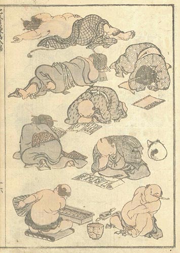 這次展覽標題的「板本」一詞在別處也以「版本」註記,但在江戶時代後期是以木刻版印製而成的書為主流,故在此使用「板本」稱之。當時葛飾北齋繪製的板本數量眾多,除了繪畫和小說的插畫之外,他畫的各式圖象也被分門別類地集結成參考用書出版,其中家喻戶曉的《北齋漫畫》描繪了江戶時代人們展讀板本時的各種樣態,他們或坐或臥、心無旁騖地沉浸於書香世界,怡然自得的模樣幾乎與愛好閱讀的現代人無異,足見板本在時人心中無窮的魅力。