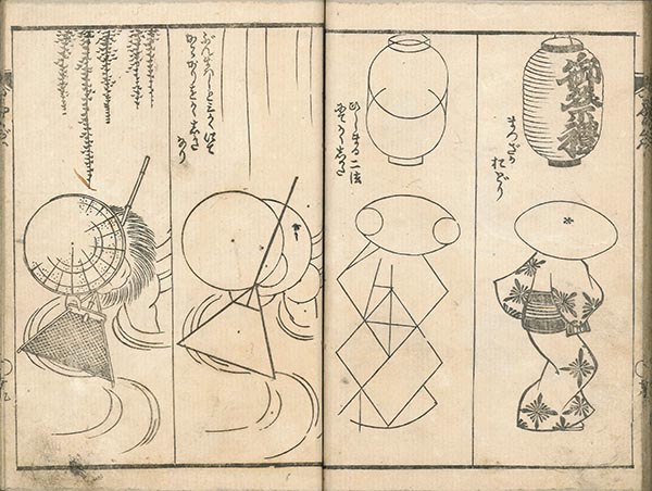 繪手本是當時人們學習繪畫方法的手冊,這類書籍最早是師者將親筆畫的圖傳授給門生摹寫之用,但當時葛飾北齋的畫作太受歡迎了,不僅拜他為師的弟子人數激增,想學畫或喜愛其作品的民眾也遍及全國,於是他的繪手本被大量印製成板本發行,職人也因此受惠而直接裁切書中圖案應用於工藝品的製作。葛飾北齋畢生不斷鑽研繪畫技巧,他在形狀方面掌握的訣竅是「萬物皆以方圓描繪」的方法,《略畫早指南》即以圖例示範如何透過尺規畫出的圓形和線條來勾勒物像的輪廓,從展出的部分內頁更可看出他對於捕捉「動」的想望,如右頁解析在民俗慶典常見人們跳著「松坂舞」的舞姿,左頁則是每到夏季便在河邊撒網捕魚的漁民,這些都是他以簡筆架構出從不同視角觀察到的人物動態。(全文閱讀570期藝術家雜誌)