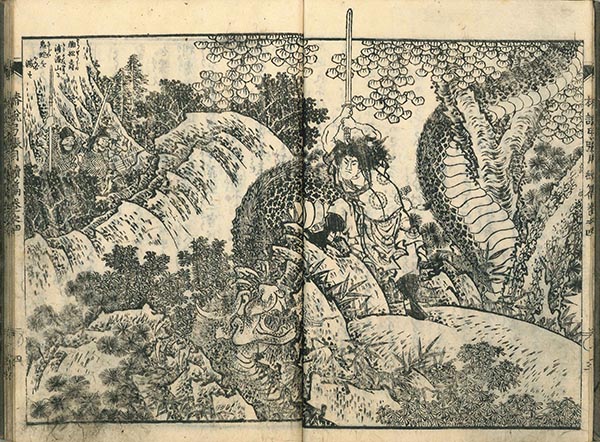 江戶時代的板本多以「讀本」和「繪手本」的形式流傳於世。讀本是取材自歷史故事並以勸善懲惡、因果報應為旨趣的小說,在文字以外的內頁加入與情節相應的插畫是讀本最大的特色,因此如何將充滿躍動感的畫納於固定尺寸的框格內相當考驗繪師的功力。當時由作家曲亭馬琴和繪師葛飾北齋合力創作的暢銷書《椿說弓張月》即為一例,全書主要描寫平安時代末期的武將源為朝被流放到伊豆大島後,一路向南在琉球國活動的故事,而這次展出書中描繪琉球王朝的忠臣陶松壽持劍斬殺毒蛇的場景,強悍的勇士和巨蟒驚懼的神情充滿了戲劇張力,尤其長劍超出格線的設計巧妙地彰顯劇情高潮的關鍵,諸如此類近似於現代漫畫的構圖往往最能吸引讀者的目光。