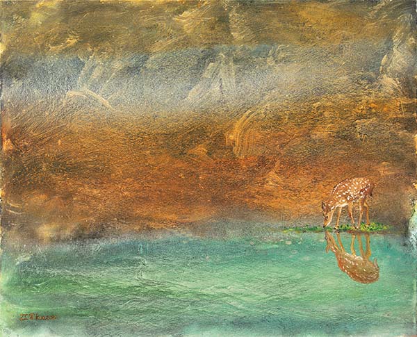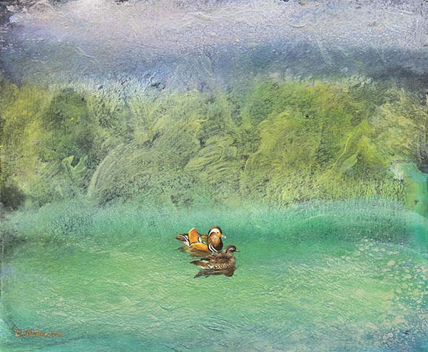 郭江宋的畫作底層或深或淺,都有國畫和書法的色調,例如〈沐戀〉、〈離離原上草〉、〈歸途〉、〈傳承〉等,先是以自動技法讓水溶性壓克力的顏色自然流動,此種驚喜的效果與期待,只能靠歲月和經驗獲得;在國畫的陶養下繼而使用水墨的渲染技法,讓色彩融合、堆疊出層次,一股迷魅的吸力引人走入畫布的世界而想隱身其中;具象的部分,則以西畫訓練下油彩的光澤和遮蔽功能,勾勒出亮眼的核心主題,聚焦觀者的視覺。長久以來郭江宋為毀損畫作「診斷治療」,致力恢復作品的光彩與樣貌,他知道如何讓畫作持久能耐,因此所有作品的畫布皆為自製水性塗底,內框使用日本的榫接型組合,麻布、碳酸鈣和動物膠也都紮實處理,對於收藏家而言是最保畫質而值得珍藏的。
