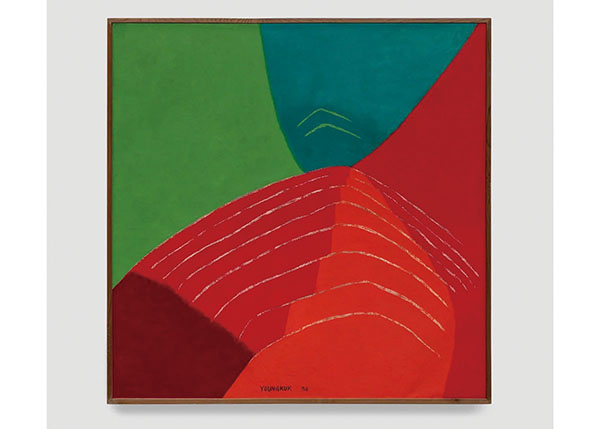 劉永國1916年出生於南韓蔚珍郡。1930年代時韓國為日本殖民地,劉永國赴東京學習藝術,在1938年取得油畫學位、1940年取得攝影學位;他在1943年返回韓國後捨棄了創作,直到韓戰結束後才重拾畫筆。劉永國的作品以鮮明色彩為標誌,在其風格強烈的抽象風景畫中經常出現粉色或紫色的山脈,以及躍然紙上的幾何元素。經歷過戰爭的歷史亂流,「山」對劉永國而言象徵著穩定性,也體現著「大自然本質的純粹抽象狀態」。