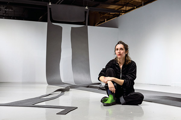 「桃創獎」首獎得主戴爾芬.普伊耶與作品〈引體向上〉於展場合影